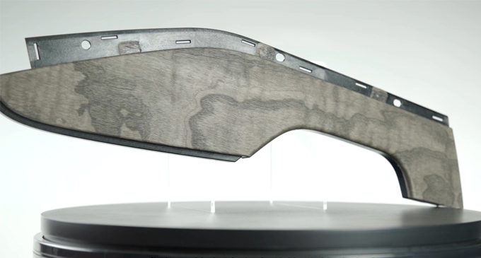 在传统真木工艺上进行了改进,使真木成型的工序更为简单,通过将真木效果的浇注在PMMA表面然后再印刷胶水再复合一层PMMA,制作好的膜片通过高压真空成型后裁切注塑。